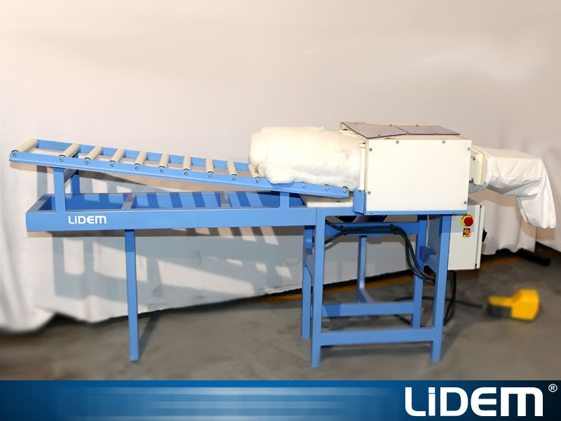 Máquina para enfundar almohadas y cojines de viscoelástica, látex, gomaespuma, guata o fibra en su correspondiente funda de gasa, tejido o TST (tejido sin tejer) de forma rápida, sencilla y eficaz.