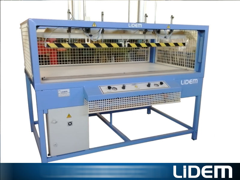 Prensa de material textil y soldado de bolsas de plástico a una cara mediante resistencia eléctrica, con presión y temperatura regulables, dependiendo del producto a empaquetar y del plástico a utilizar.
