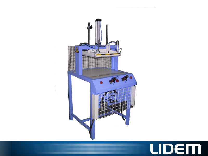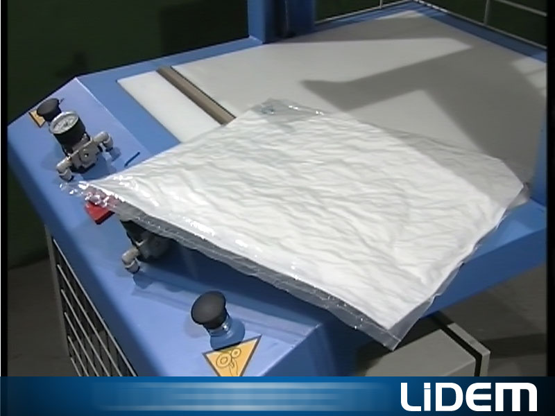 Prensa de material textil y soldado de bolsas de plástico a una cara mediante resistencia eléctrica, con presión y temperatura regulables, dependiendo del producto a empaquetar y del plástico a utilizar.