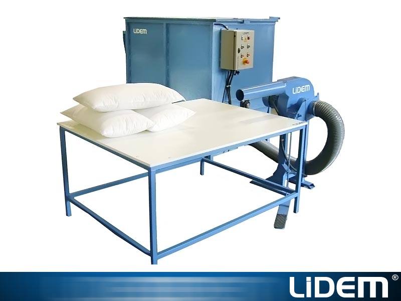 Machines for filling pillows, cushions, stuffed animals, pouffes… with fibre, feathers, foam, and expanded polystyrene. Machines for pressing, packaging, vacuum packaging, rolling and packaging of pillows, cushions, duvets, eiderdowns, blankets, etc.